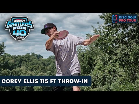 Watch Corey Ellis' incredible 115 FT throw-in attempt for birdie at Discraft's Great Lakes Open, showcasing precision and skill.