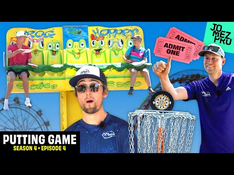 Top players face roller coaster obstacles at an epic amusement park disc golf challenge in Jomez Putting Game S4E4.
