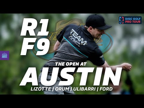 Watch top pros Lizotte, Orum, Ulibarri, and Ford compete at The Open At Austin in R1F9 - thrilling shots and expert disc golf skills on display!